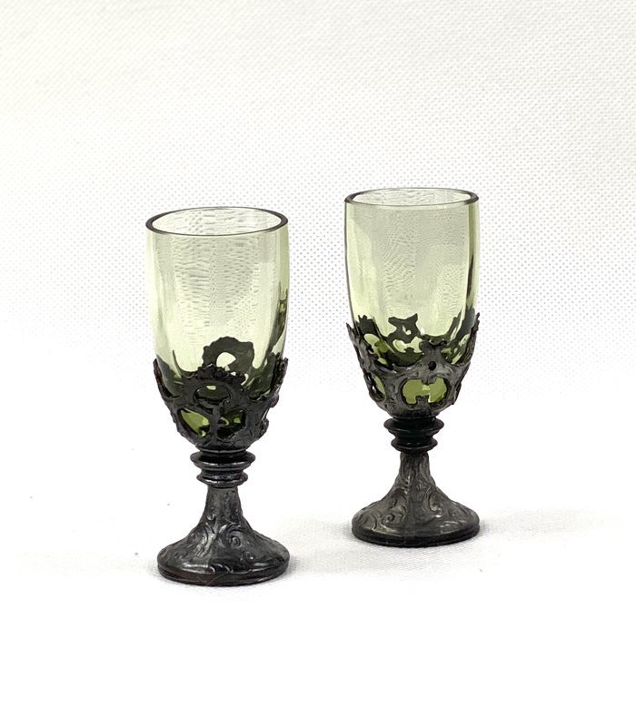Sklenice na likér z lesního skla s ručně odlévanými cínovými prvky, vyrobený tradičními postupy české sklárny a cínařské dílny. Věrná replika historického skla, poctivá ruční práce mistrů z podhůří Lužických hor.