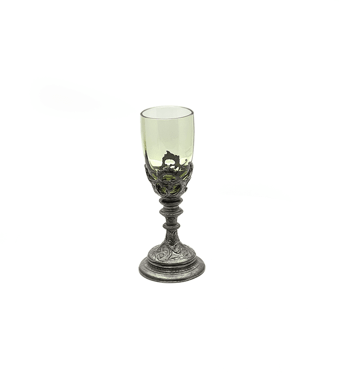 Sklenice z lesního skla s ručně odlévanými cínovými prvky, vyrobený tradičními postupy české sklárny a cínařské dílny. Věrná replika historického skla, poctivá ruční práce mistrů z podhůří Lužických hor.